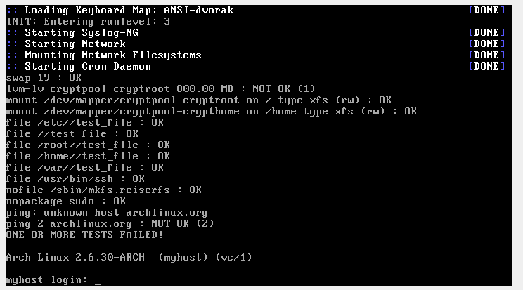 aif -p automatic -c /usr/share/aif/examples/fancy-install-on-sdaAnd bam you have a complete working system with LVM, dm_crypt etc all set up. You just need to change your keymap, hostname, network config and such (or, configure that on the beforehand in the config file for AIF)