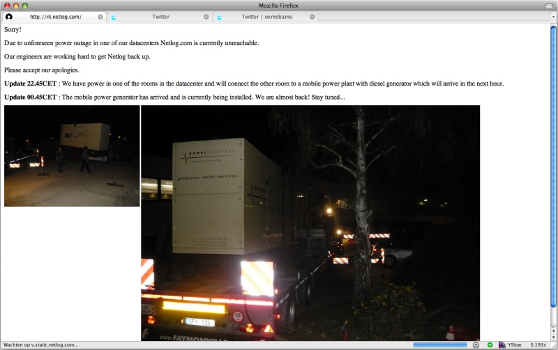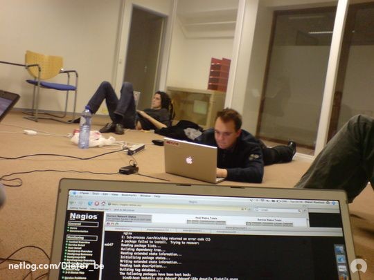 Long story short: LCL couldn't bring the power back up fast enough so we rented our own generator. After rushing to Brussels we ( The Netlog ITS-team) could sit in the offices upstairs. But after a while they had to close it down but we could stay in a room nearby (without furniture). After that we went to Steven's appartment in Machelen. We worked about 30 hours in a row, getting our sites back up and running (mostly fixing corrupted databases). Our friends from the devteam also did some great achievements the next day, by using the redundancy of denormalized database layouts they could restore nearly all missing content that had vanished because of table repairs.